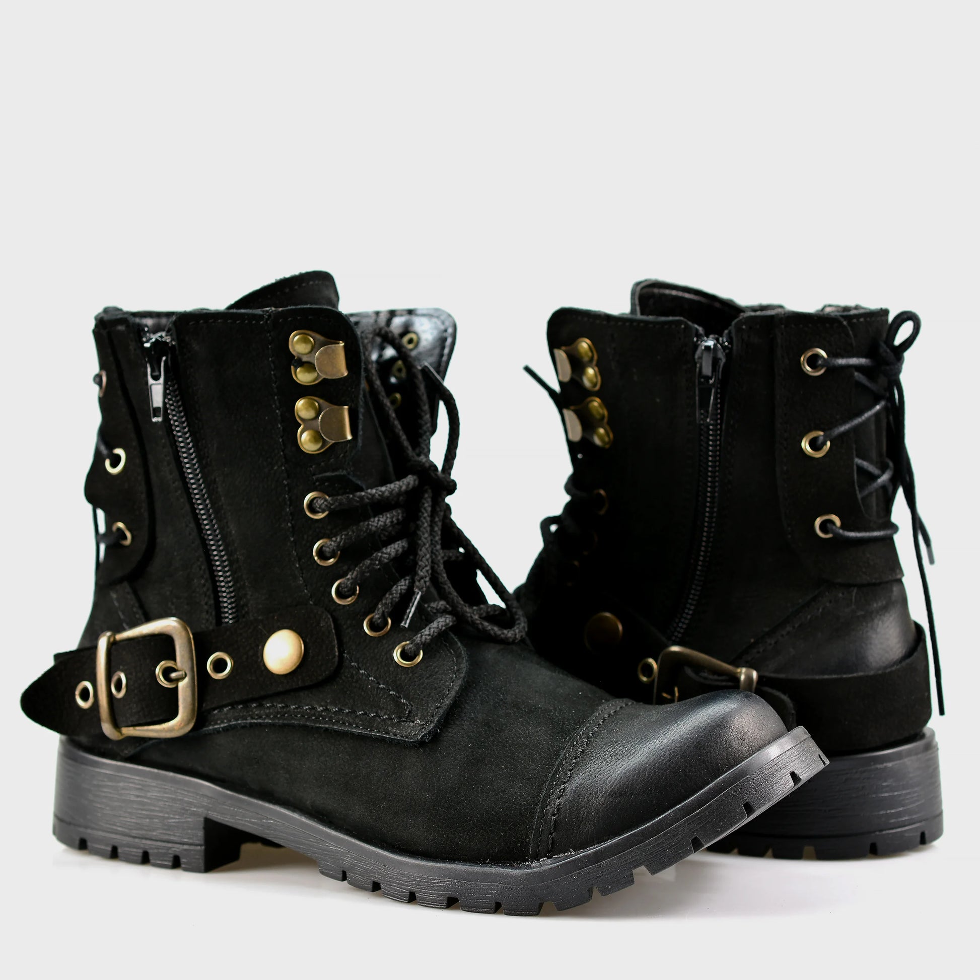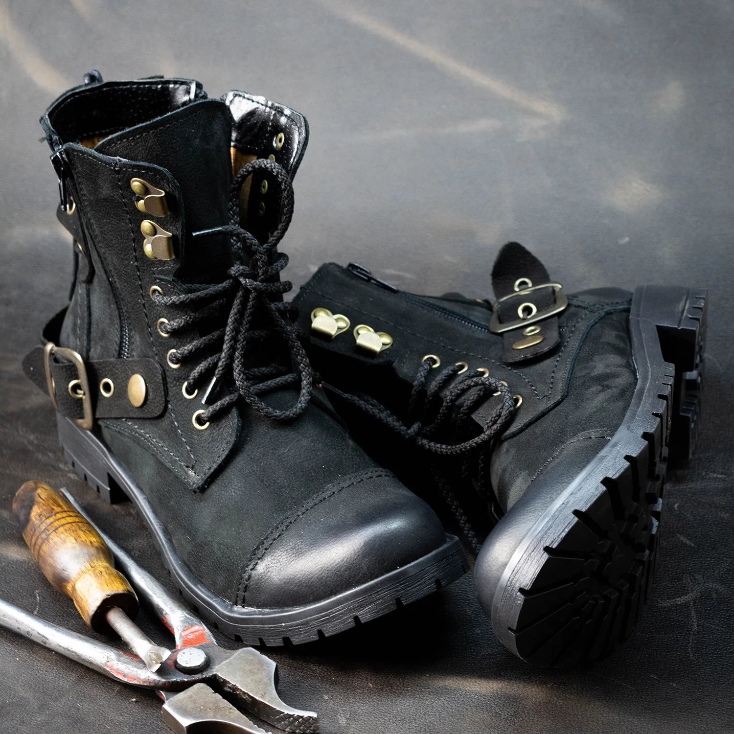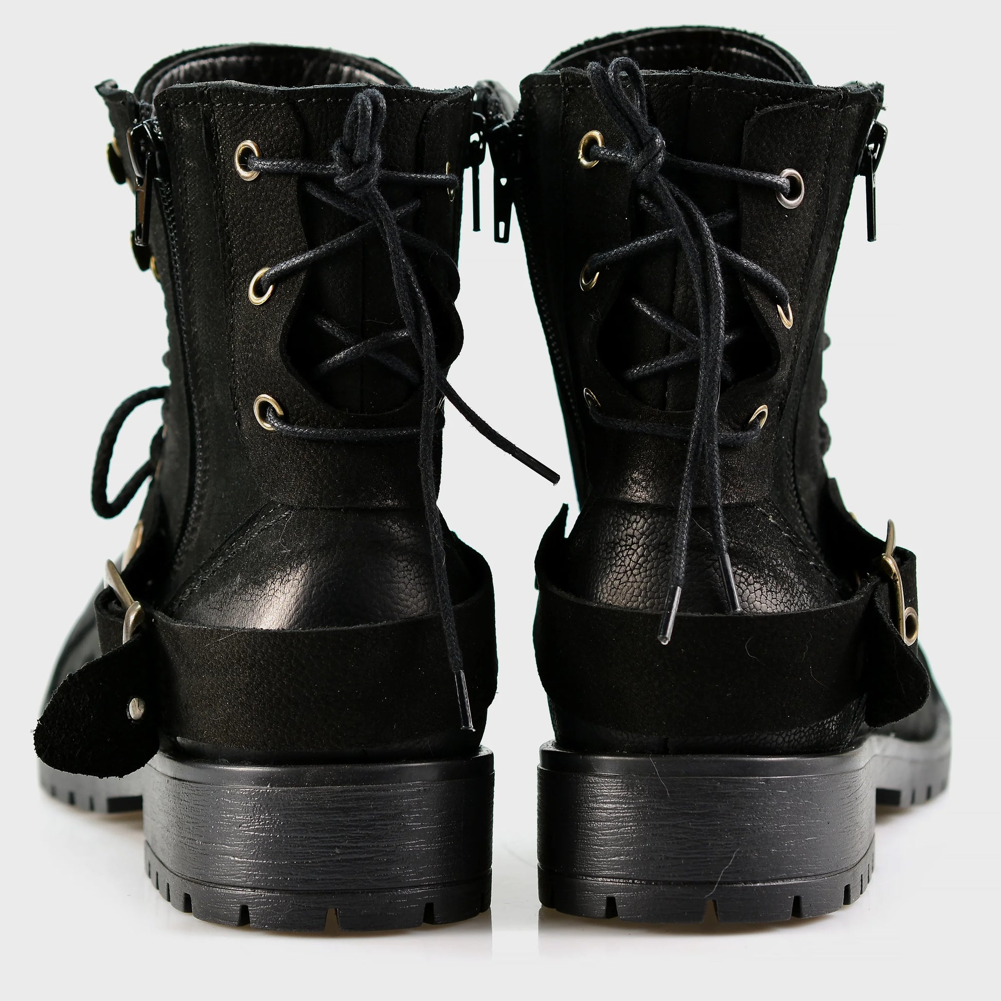 - Higher ankle profile — confident silhouette with biker attitude