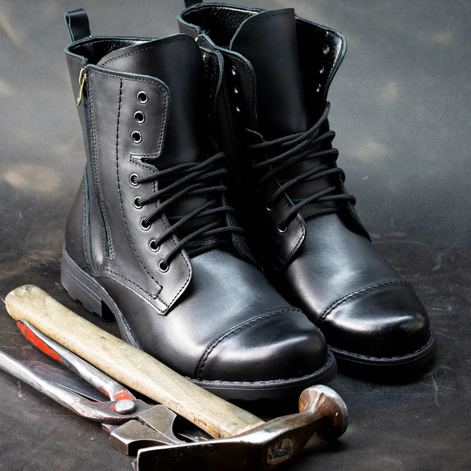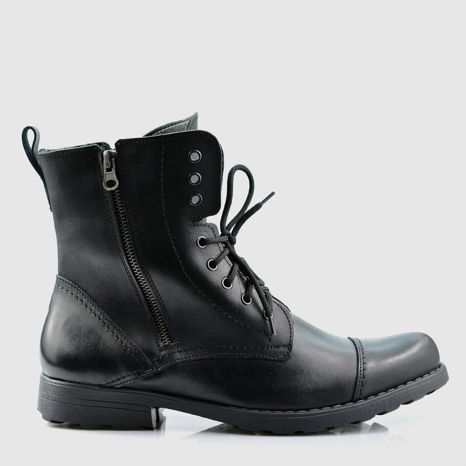 The Elegant are handmade men’s military-style leather boots with a raw, assertive profile. Crafted in Poland from premium full-grain black leather, they combine a chunky lugged sole, side zippers for quick on/off, and precise toe-cap stitching — a masculine style with a touch of refinement for city wear and beyond.