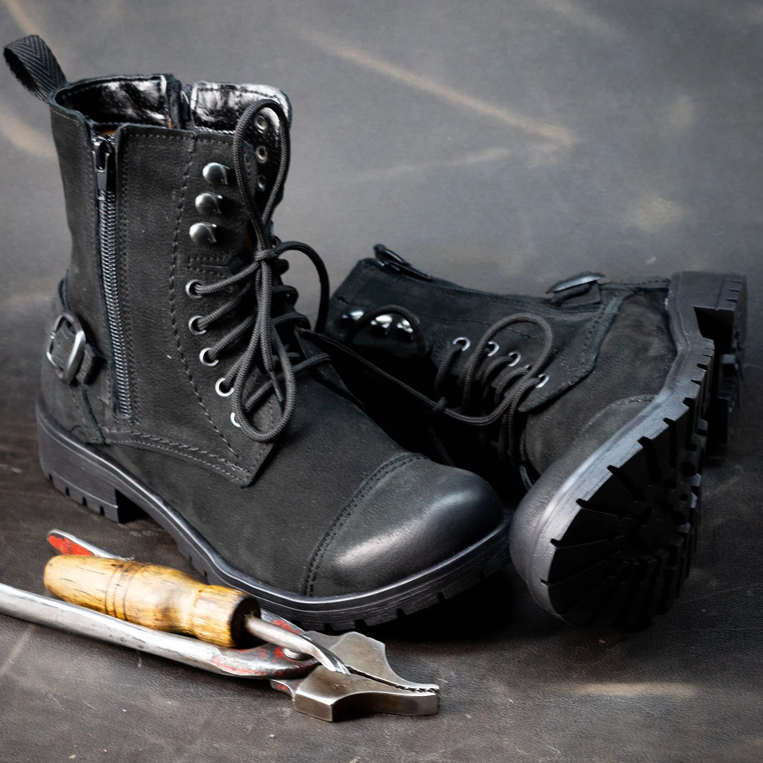 • Higher ankle profile — confident silhouette with biker attitude