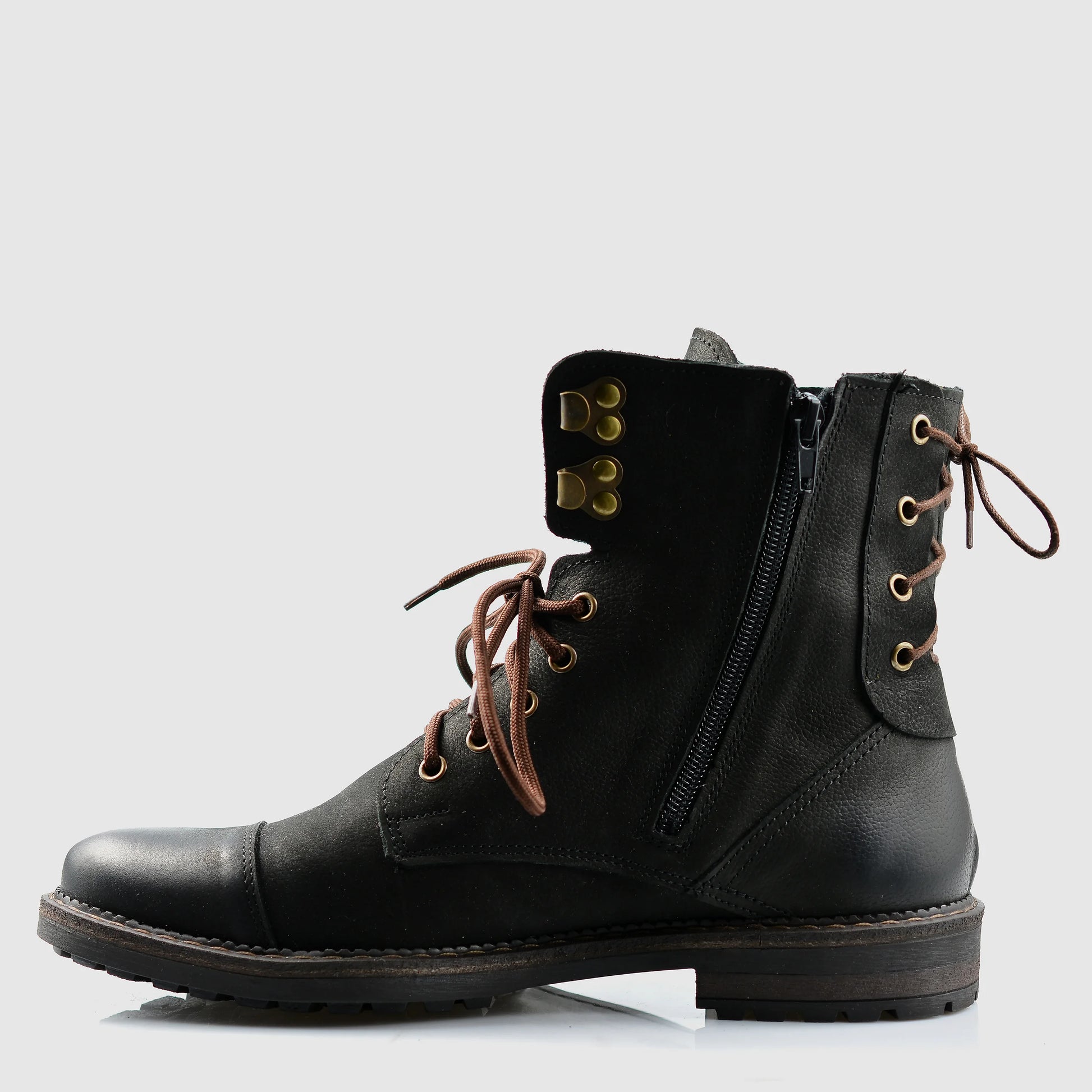 Boty Marc jsou ručně vyrobeny z kvalitní černé přírodní kůže s lehce surovou strukturou. Detaily jako kontrastní hnědé tkaničky, mosazné háčky a boční zip zajišťují nejen styl, ale i komfortní nazouvání a pevné uchycení nohy.